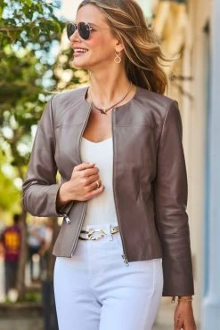 Taupe Zip Front Round Neck Leather Jacket