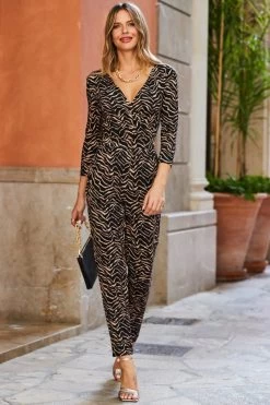 Natural Animal Print Satin High Neck Keyhole Detail Jumpsuit