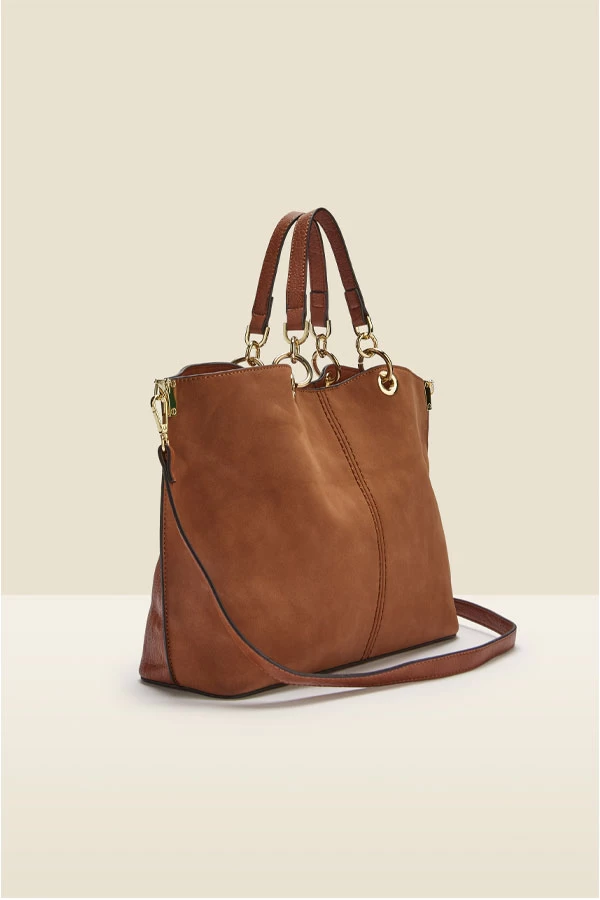 Tan Faux Suede & Leather Tote Bag With Shoulder Strap